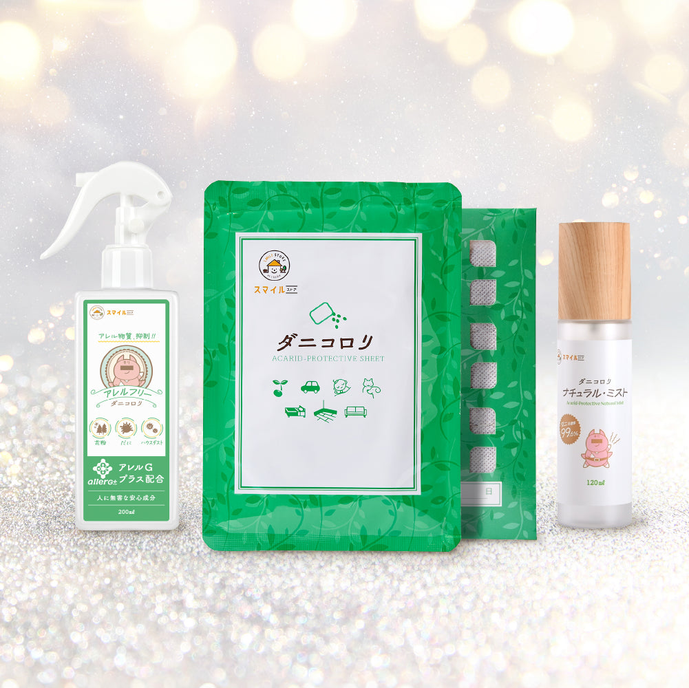 Not only live mites, but also dead mites and droppings can cause allergies. Especially tiny particles can easily float in the air and be inhaled without notice. Danikorori kiwami works with the power of the astringent components (tannins) found in plants to address allergens such as dust mite feces and corpses, thoroughly caring for even the invisible risks.
